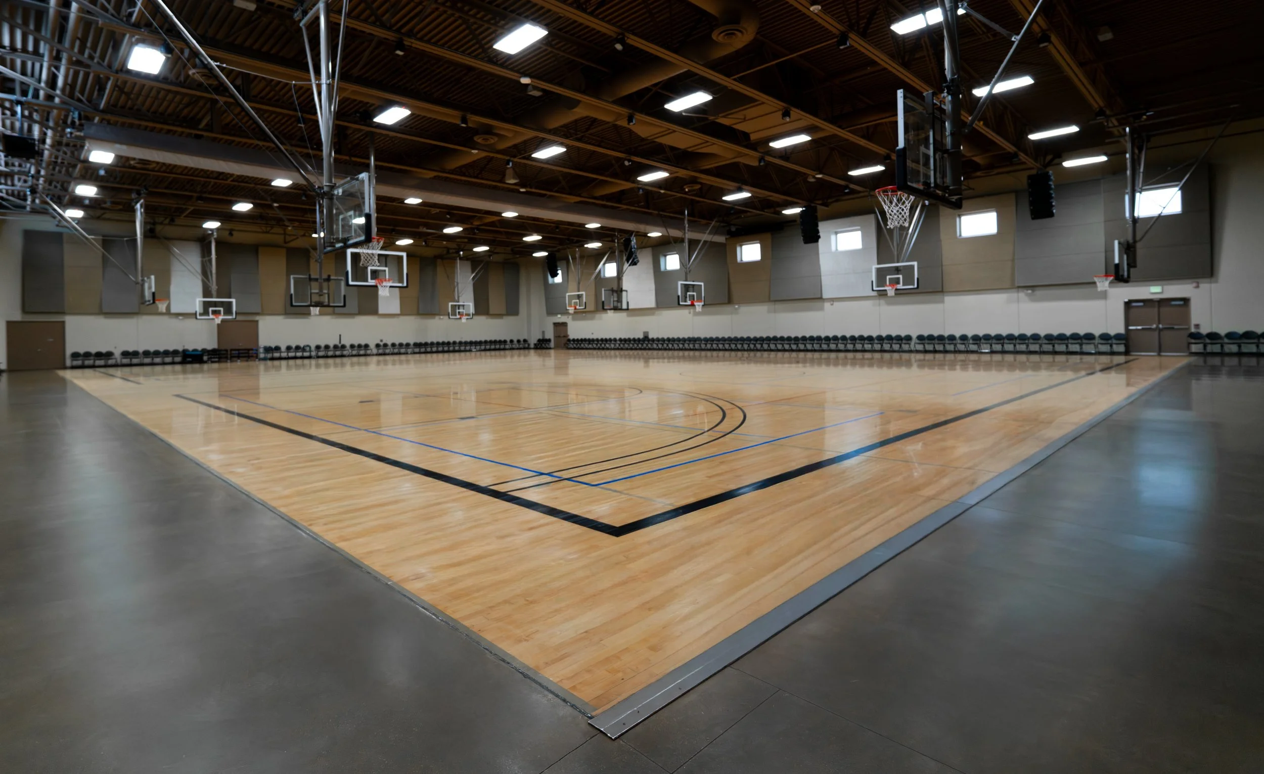 The Event Hall is a 15,000 square-foot area with several venue options. It can be a carpeted venue for large groups of up to 1,200 arranged in either theater or banquet seating, or a maple-floored gym space with two regulation-sized basketball courts or up to four volleyball courts.